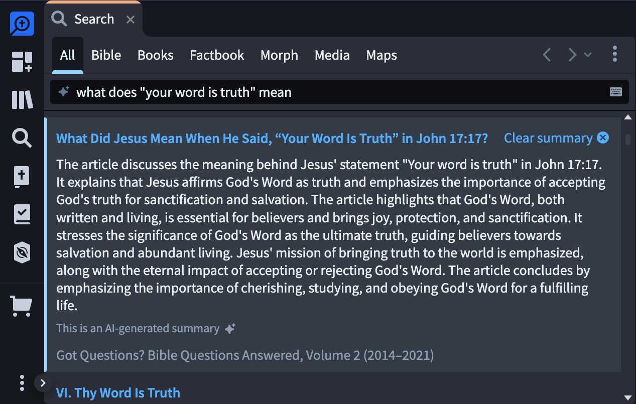 Have you ever started reading a book, only to decide after some time that it was not worth your time? The new summarize feature provides a synopsis that helps me determine whether or not a resource is worth reading in its entirety. When used in conjunction with the search feature, Logos provides an overview of a topic, or theological concept.